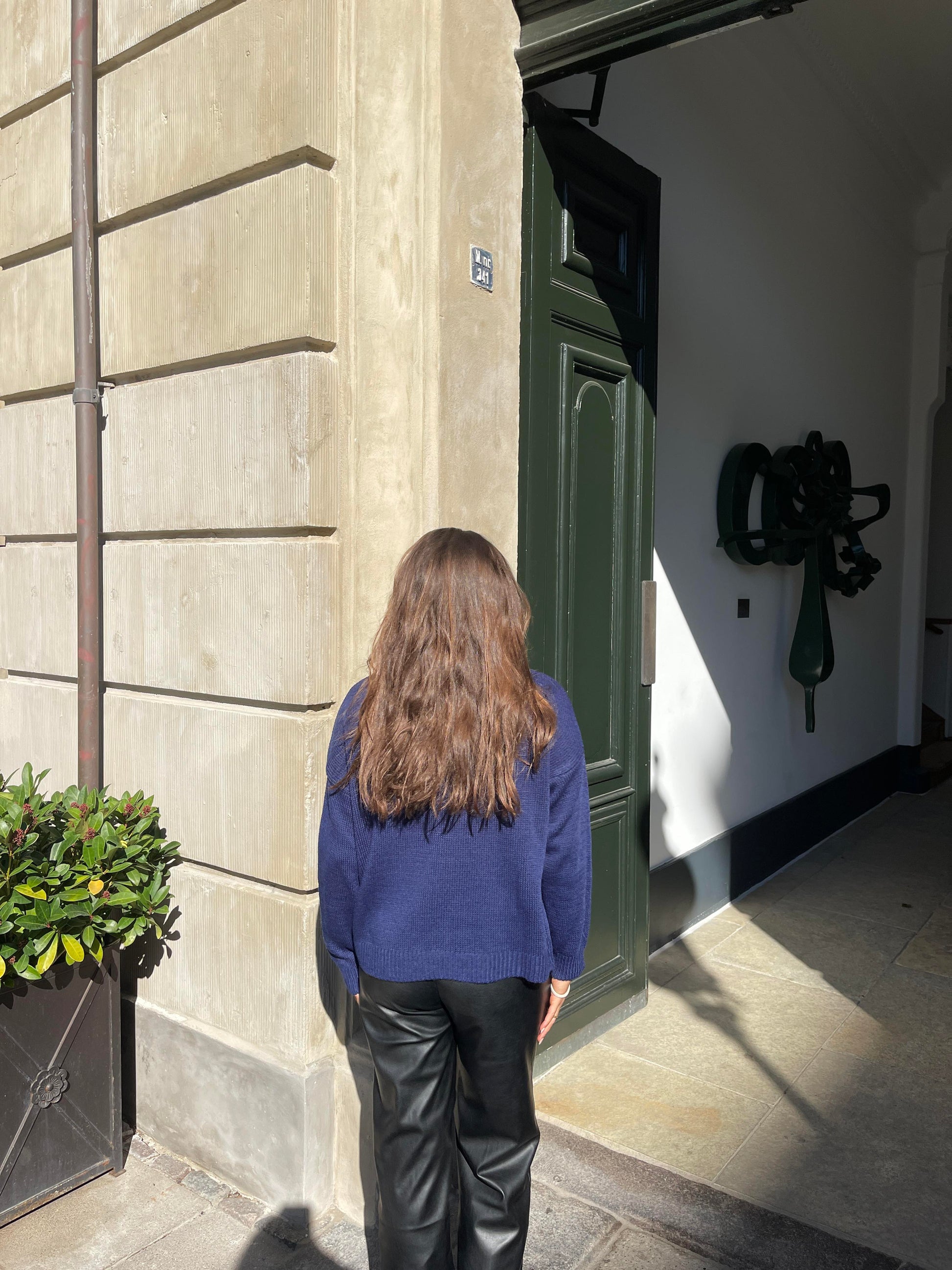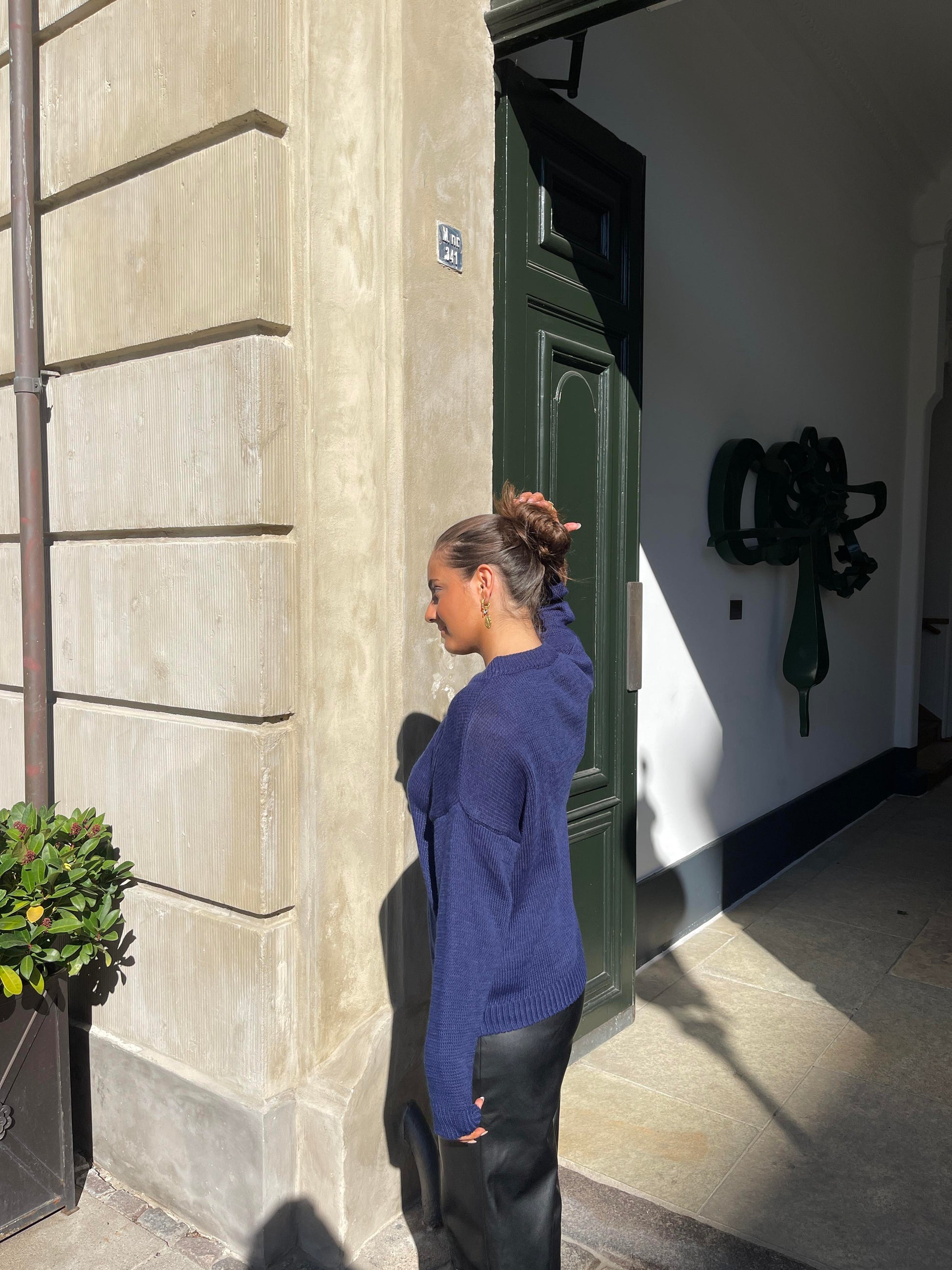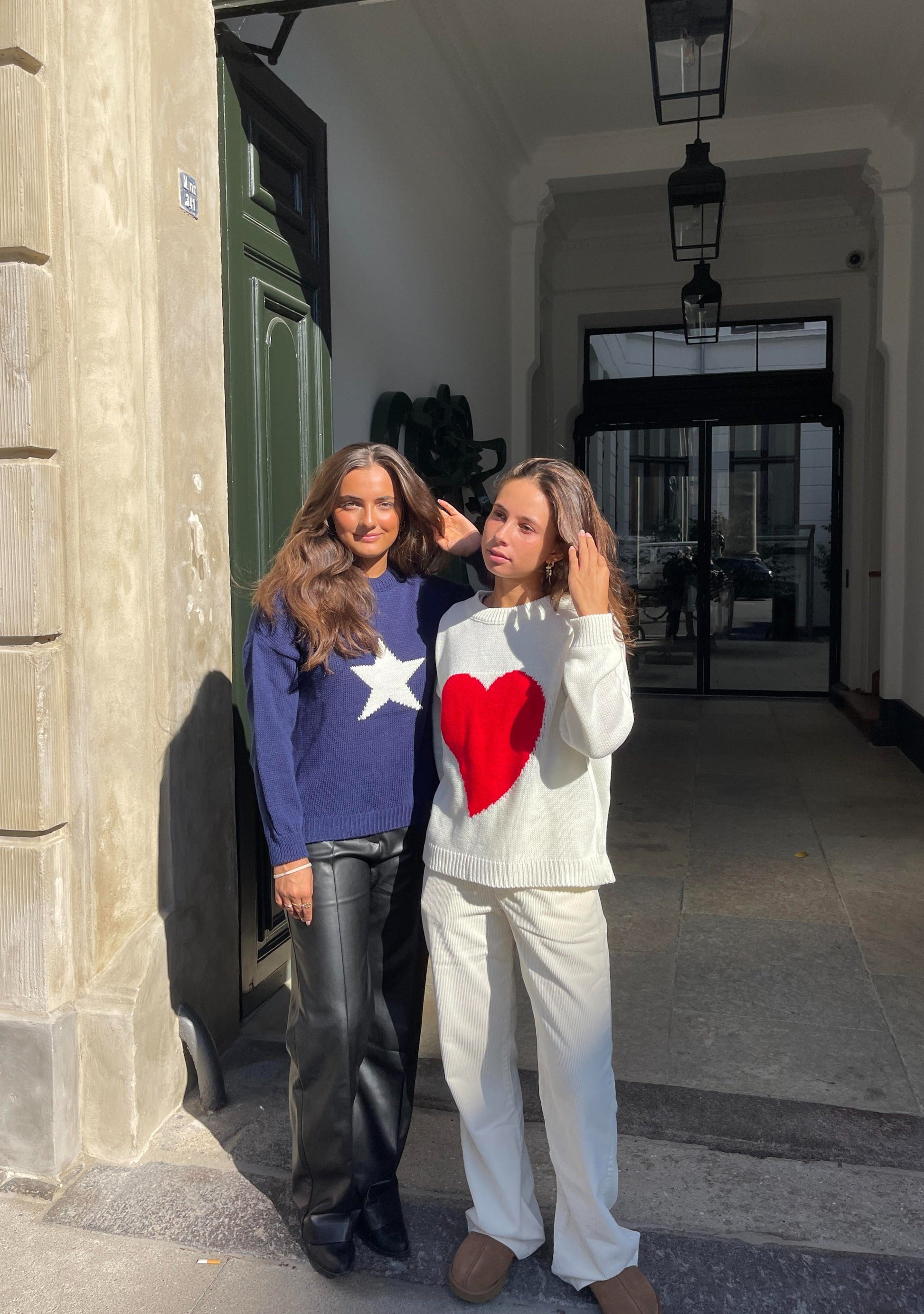 Dieser marineblaue Strickpullover hat einen übergroßen und lockeren Look. Der Pullover hat einen großen weißen Stern auf der Vorderseite. Er hat einen Rundhalsausschnitt mit geripptem Rand, geripptem Saum und Ärmelabschlüssen.
